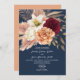 Convide seus hóspedes em estilo com este elegante convite de casamento floral de burgundy e marinho azul. Apresentando rosas de aquarelas em burgundy, pêssego e marfim com grama-pampas e verde em um rico fundo de marinho, este design é perfeito para o outono ou casamentos no inverno. Personalize com seus nomes, detalhes de casamento e local para criar uma manutenção de eterno. Cartões RSVP, cartões de detalhes, menus, programas, salvar datas e sinais de boas-vindas estão disponíveis em nossa coleção para um pacote de casamento totalmente coordenado.