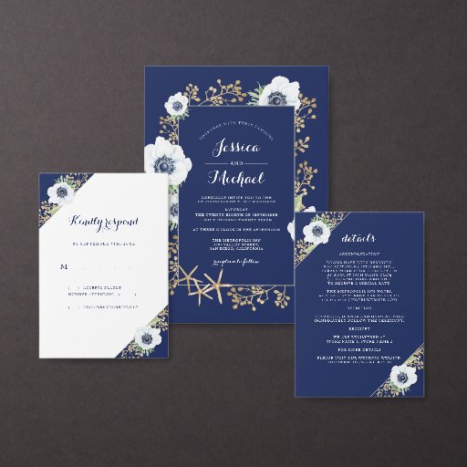 Convites Casamento Azul de Marinho de Flor Anêmona Monogram
