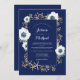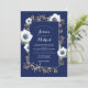 Flores anêmonas brancas com galhos ouros e folhas formando uma bela estrutura. (Dourado não é ouro real, mas impresso.) fundo azul marinho. Monogramas da noiva e do noivo com folhas de ouro. Design de casamento elegante e moderno.