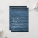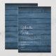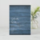 Simples convite de casamento rústico com os nomes de casais felizes em um roteiro elegante acima dos detalhes especiais de casamento em um fundo de madeira azul-marinho rústico. O reverso apresenta um fundo de madeira rústica correspondente. Projetado por Thisnotme©