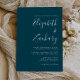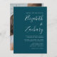 Este simples convite de casamento moderno apresenta um texto branco sobre um fundo azul teal. Adicione os nomes da noiva e do noivo na caligrafia de escrita manual do na moda e os detalhes na fonte sans serif. Substitua facilmente a imagem de exemplo no verso por sua própria foto.