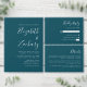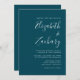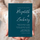 Este simples convite de casamento moderno apresenta um texto branco sobre um fundo azul teal. Adicione os nomes da noiva e do noivo na caligrafia de escrita manual do na moda e os detalhes na fonte sans serif. O lado inverso é uma sombra correspondente de palha sólida.