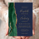 A borda esquerda deste elegante convite de casamento moderno apresenta uma esmeralda verde aquarela agate borda com falsa brilho dourado. O texto personalizável combina manuscrito dourado, fontes em copperplate e itálico em um fundo de marinho. O verso apresenta um design emerald verde e dourado.