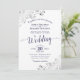 Este belo convite para o casamento apresenta um design simples, mas elegante, com texto azul marinho e caligrafia de alfaiate em um fundo branco e filigre faux cinza prateado nos cantos. A formulação é formal, mas a disposição é moderna e na moda.