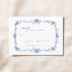 Melhore sua suíte de casamento com um cartão Vintage francês RSVP em azul marinho elegante. Este design apresenta intrincados motivos florais e tipografia clássica, capturando a essência do charme de vintage com um talento de inspiração francesa. A cor azul macia adiciona um toque romântico refinado, complementando um tema de casamento sofisticado. Perfeito para casais que buscam uma mistura de tradição e elegância, esta placa RSVP emparelha lindamente com convites correspondentes, garantindo uma apresentação coesa e graciosa para seu dia especial.