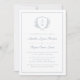 Convite de Casamento Azul Monogramado. Este convite de casamento elegante e sofisticado apresenta uma crista de folhas em azul poeirento com o monograma da noiva e do noivo e uma borda dupla clássica. O texto é azul poeirento, e a parte de trás do convite é azul poeirento.