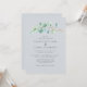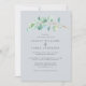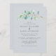 Chic, convite de casamento simples e moderno com tipografia clássica elegante e um toque na moda de verde folhagem de eucalipto num fundo azul pastel. Desenvolvido exclusivamente para você pelo Happy Dolphin Studio. Se precisar de ajuda ou produtos correspondentes, entre em contato conosco em happydolphinstudio@outlook.com.