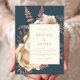 Este elegante convite para o casamento apresenta um buquê floral romântico, luxuoso, no marfim, com folha de ouro rosa e folhagem brilhante num fundo azul escuro. Personalize o texto cor-de-rosa rosa em fontes na moda num retângulo de marfim. A parte traseira da placa é sólida.