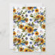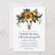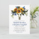 Convites de casamento boho azul marinho e amarelo em aquarela com um fundo branco clássico que pode ser alterado para qualquer cor, uma exposição floral de girassol, penas, caveira de animal e um modelo de convite de casamento elegante.
