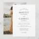 Um convite de casamento com tipografia minimalista moderna e elegante com um tipo de letra manuscrita moderna e um tipo serif inspirado em inscrições romanas do primeiro século, e baseado em proporções clássicas. O verso do convite apresenta uma foto de casamento elegante. Personalize com sua própria foto carregada. Estilo limpo e moderno. Disponível para impressão, como download digital ou ambos!
