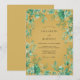 Este design artístico apresenta um rico fundo ocre adornado com verde botânico em tons de azul-turquesa e verde-sage. Delicadas videiras e ramalhetes de eucalipto criam uma borda vibrante em torno da área central. A paleta de cores de amarelo profundo e verdes frescos evoca uma atmosfera outonal sofisticada.