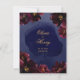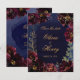 Um convite de casamento azul-marinho bordô com uma sinfonia de peônias vermelhas bordô profundas adornadas com spray dourado e contornos dourados brilhantes reunidos em torno de um fundo de lavagem de aquarela azul-marinho com seus nomes grandes em letra rústica dourada com uma fonte sem serifa maiúscula anunciando seus detalhes.