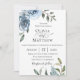 Lindas flores botânicas azuis empoeiradas e folhagem macia, convite para casamento.