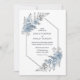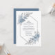 Um convite de casamento elegante, azul empoeirado, com folhas de samambaia e margaridas, guardadas por uma simples falso armação.