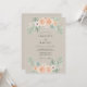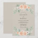 Este design apresenta uma estética de aquarela suave e romântica com foco em elegância natural. Um fundo bege suave fornece um clima quente e vintage para os delicados arranjos florais de pêssego e creme. Rosas de pêssego exuberantes são combinadas com minúsculas anemônias brancas e folhas de eucalipto verde-sage prateado. Esses aglomerados florais simétricos criam um visual botânico equilibrado e sofisticado.
