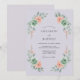 Este design botânico apresenta um fundo lilás suave acentuado por rosas cor de pêssego e suculentas verde-sage. Folhas verdes aéreas em aquarela e eucalipto criam uma estética romântica para um evento de primavera. A paleta de cores combina tons de coral quentes com tons de roxo frios para um visual sereno e caprichoso.