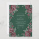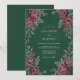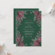 Este design apresenta um fundo verde floresta profundo que contrasta lindamente com rosas burgundy ricas. Folhas em tons prateados delicados e caules botânicos adornam o layout, criando uma estética sombria e sofisticada para um evento formal de inverno. O arranjo floral exuberante inclui flores abertas e pequenos botões para um visual refinado.