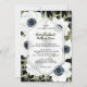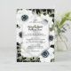 Flores elegantes de anêmona preto e branco e deixa aquarela em fundo preto, seus detalhes da cerimônia de núpcias em letra chic são apresentados em uma entrada transparente de diamante branco. CORRESPONDENDO a itens na nossa loja.