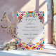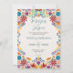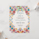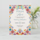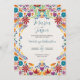 Esse design de Convite para Casamento Botânico da Nuestra Boda Mexicana apresenta um arranjo floral rico e vibrante ao redor das bordas, com cores ousadas como vermelho, laranja, azul, roxo e amarelo que criam um sentimento festivo e acolhedor. As flores são intricadamente combinadas com padrões folhosos e pequenos e detalhados embelezamentos, dando ao design um olhar vivo e texturizado. O equilíbrio entre cores brilhantes e contrastantes e o arranjo delicado e simétrico fazem disto uma opção atraente para uma papelaria de casamento celebratória, especialmente aquela com um tema tradicional ou folclórico.