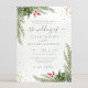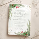 Bonito convite para o casamento, com ilustrações botânicas a cores pintadas à mão, de verde-inverno, pinheiro e ramos de abeto, cones e bagas ocas com brilho dourado. Escolha perfeita para casamentos temáticos de inverno ou Natal.