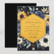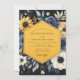 Este design elegante apresenta uma disposição floral dramática contra um fundo escuro. Girassóis dourados vibrantes e rosas azuis profundas criam um contraste visual impressionante. Toques de anêmonas brancas e folhagens prateado-esverdeadas completam esta composição botânica luxuriante e romântica para uma união sofisticada.