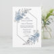 Um convite de casamento elegante, azul empoeirado, com folhas de samambaia e margaridas, guardadas por uma simples esquadra de falso brilho. As informações de RSVP foram incluídas nessas informações para que seus convidados as lembrem de responder.