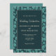 O Elegante Turquoise Leaf Pattern Botanical Wedding Invitation. Folhas de turquesa sobre fundo escuro. O padrão folha enquadra o texto. Você pode personalizar facilmente todo o texto - personalizá-lo com o nome da noiva, o nome do noivo, a data e hora, o local e alterar ou apagar qualquer texto no cartão.