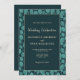 O Elegante Turquoise Leaf Pattern Botanical Wedding Invitation. Folhas de turquesa sobre fundo escuro. O padrão folha enquadra o texto. Você pode personalizar facilmente todo o texto - personalizá-lo com o nome da noiva, o nome do noivo, a data e hora, o local e alterar ou apagar qualquer texto no cartão.