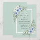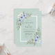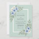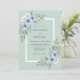 Este design apresenta um fundo suave verde espuma do mar decorado com delicadas flores em aquarela em tons de azul céu e marfim. Folhas elegantes de eucalipto e raminhos de folhagem acentuam a composição, criando uma estética botânica serena. Perfeito para um evento romântico de primavera ou verão, esta obra de arte evoca um sentido de beleza natural e tranquilidade.