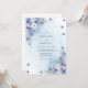 Este design etéreo apresenta uma lavagem serena de aquarela azul centáurea. Flores delicadas de delphinium e anemôna branca são combinadas com folhagem suave de sage verde para uma sensação leve e aérea. Esses elementos botânicos pictóricos criam uma atmosfera romântica e sofisticada perfeita para um evento de primavera ou verão.