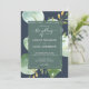 Convite de casamento elegante com um design botânico de eucalipto verde sobre um fundo azul marinho. Basta adicionar os detalhes do seu casamento. Se precisar de ajuda ou produtos correspondentes, entre em contato conosco através da nossa loja.