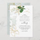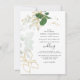 Convite de casamento botânico moderno, com folhas de folha de ouro e folhagem de eucalipto verde com moderno roteiro escrito à mão e tipografia popular em fundo branco. Perfeito para um casamento botânico, moderno e elegante neste verão ou outono