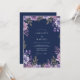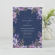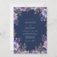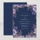 Delicadas flores de lavanda e lilás cascateiam sobre um fundo azul-marinho profundo. Acentuam folhas douradas que adicionam um toque de sofisticação a este arranjo floral etéreo. O design evoca uma atmosfera romântica e refinada para o seu dia especial.