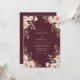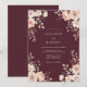 Este design apresenta um fundo malva profundo que cria um clima sofisticado e atmosférico. Rosas pêssego delicadas e flores rosadas fornecem um contraste suave contra a base escura. Folhas de eucalipto em tons de sage verde e cinza adicionam um toque de natureza ao arranjo floral. É uma escolha ideal para um evento outonal romântico.