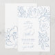 Cartão de casamento azul empoeirado com elegante mão botânica desenhada flores para um casamento na moda moderno. Linda arte de linha impressa à mão sobre fundo branco, sobre tendência de design com texto de script. Iniciais e buquê atrás.