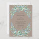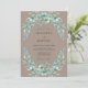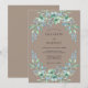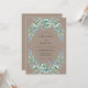 Este design apresenta um fundo bege quente combinado com flores delicadas em aquarela em tons de azul poeirento e verde menta. Anêmonas pintadas à mão e folhagem exuberante de eucalipto criam uma atmosfera orgânica e serena para um tema rústico. A paleta suave evoca um senso de elegância natural e charme florestal.