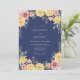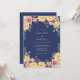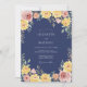 Um fundo marinho profundo cria um cenário sofisticado para flores vibrantes em aquarela em tons de amarelo solarengo, pêssego e rosa suave. Rosas pintadas, ranunculus e folhagens verdes delicadas criam uma atmosfera romântica. Este design botânico destaca uma arte elegante através de pinceladas suaves e contraste de cores ricas.