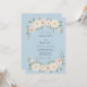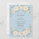 Um fundo suave azul pó define um tom refinado e romântico para este design. Elegantes guirlandas de aquarela de rosas creme e flores de pêssego pálido são combinadas com folhagem de eucalipto verde suave. Esta estética etérea e arejada cria um visual sofisticado para um evento clássico de primavera ou verão.