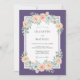 Este design apresenta um fundo de ameixa profunda combinado com flores de aquarela suaves. Rosas pêssego delicadas e anemônias azul claro estão aninhadas entre a folhagem de eucalipto verde-sage suave. A paleta de cores românticas e o estilo elegante criam um clima sofisticado para um evento de primavera ou verão. Elementos botânicos exuberantes proporcionam uma estética atemporal para uma ocasião clássica.