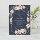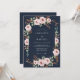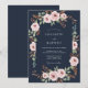 Este design apresenta um fundo azul meia-noite profundo complementado por rosas cor-de-rosa suaves e folhas de eucalipto intrincadas. A paleta de cores sombria evoca um senso de elegância sofisticada, tornando-a ideal para um evento formal noturno ou outonal. Flores e folhagens ricas em detalhes em aquarela criam uma estética exuberante e atmosférica.