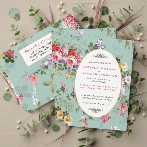 Estes convites são perfeitos para qualquer casal planejando uma celebração romântica de casamento no jardim. O design apresenta um fundo floral vintage com uma armação decorativa de pá de ouro e é acabado com uma redação elegante que utiliza as mesmas cores escolhidas a partir do design de fundo floral. O design simples pode ser personalizado para se adequar ao seu evento especial e será o anúncio perfeito para qualquer festa temática botânica, incluindo chás de panela, noivados, chás de casamento, festas de aniversário e muito, muito mais.