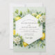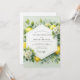 Experimente a elegância fresca de uma união inspirada no Mediterrâneo. Este lindo design apresenta limões amarelos vibrantes e delicadas flores brancas aninhadas entre folhagens verdes exuberantes. A arte em aquarela sobre um fundo verde pálido cria uma atmosfera leve, arejada e romântica, perfeita para uma cerimônia matrimonial chic e ensolarada.