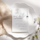 Convite de casamento moderno e clássico de preto e branco com linhas limpas, tipografia elegante e data de casamento no canto superior direito.