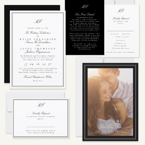 Monograma clássico com estrutura formal Convite de casamento branco preto ***este design faz parte de uma coleção*** __________________________ este modelo é totalmente editável e personalizável por você o cliente - clique em personalizar mais um botão se desejar mover, adicionar, excluir ou fazer alterações significativas no design _______________________ *se tiver perguntas sobre DESIGN ou precisar de mais designs ou opções, contacte-me __________________________ *se tiver perguntas sobre ENTREGA ou PRODUÇÃO contacte a ZAZZLE HELP OU CUSTOMER SERVICE em https://help.zazzle.com/