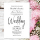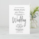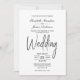 Um convite de casamento branco elegante e minimalista com texto preto.