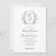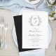 Um convite de casamento branco preto clássico apresenta uma crista de arte botânica com seu monograma. Personalize com todos os detalhes importantes como seus nomes, data do casamento, hora e local. O reverso é coordenado em preto