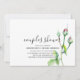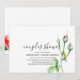 Elegante e moderno convite de casais para chuveiro tema floral aquarela manuscrito em branco com rosas vermelhas e botões, folhas verdes com espaço no verso para detalhes adicionais. Para suprimentos de festa correspondentes, entre em contato com o designer. Você pode transferir este design para um convite magnético ou outro tamanho, estilo conforme desejado.