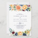 Este convite de casamento casual floral multicolorido é perfeito para um casamento moderno. A design apresenta buquês perfeitamente desenhados à mão de rosa, pincelado, amarelo, burgundy, vermelho, indigo e folhagem verde, inspirando beleza natural.