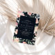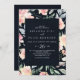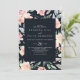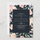 Este elegante convite para casamentos casuais florais geométricos cor-de-rosa é perfeito para um casamento moderno. A design apresenta rosas rosas desenhadas à mão e peônias com folhas verdes e cinzas num fundo azul escuro, inspirando beleza natural.