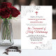 Este belo convite para o casamento é perfeito para uma cerimônia católica moderna. Apresenta uma bela design com uma elegante letra vermelha de crimson e uma cinza de prata de ornamentado com caracóis e espirais nos cantos de um fundo branco clássico. Inclui uma cruz ou crucifixo, e uma formulação convidando seus convidados a assistir a uma massa nupcial unindo o casal no sacramento do matrimônio sagrado. Este convite é a combinação perfeita de tradição formal e estilo moderno, fazer uma maneira maravilhosa de convidar seus amigos e família a compartilhar sua alegria no seu dia especial.